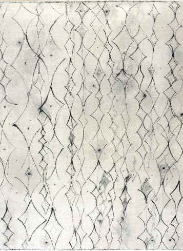In Segment, a drawn line is employed to section off an ethereal field into segments of merging mist. The lines add structure while still maintaining movement in the watercolor design.